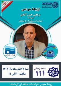 درهمین راستا مردم شریف استان کرمانشاه می توانند سوالات، مشکلات، انتقادات و پیشنهادات خود را از طریق سامانه تلفنی ۱۱۱ و در زمان مذکور با شخص مدیر عامل شرکت آب منطقه ای کرمانشاه مطرح نمایند.