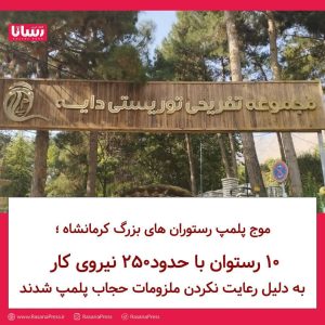 🔶 مجموعه تفریحی توریستی دایه و تعدادی دیگر از باغ رستورانهای کرمانشاه روز شنبه به دلیل آنچه رعایت نشدن ملزومات حجاب خوانده شده است پلمپ شدند.